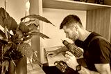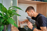 Worker using electric drill to drilling hole in wooden board. Man assembling furniture at home, preparing shelf to installing in self made cabinet. Concept of renovation and interior improvement