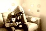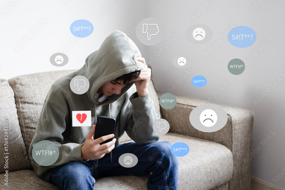 Teen mental health problem, social media harassment concept. A preteen schoolboy, teenager using smartphone alone feeling frustrated after reading bad comments, text negative emoticons.