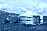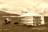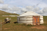 Traditional nomadic tents and a wooden wheeled horse-drawn cart in the rural areas of Ulaanbaatar, the capital of Mongolia.