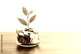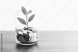 Coins in a bottle and the green tree, Represents the financial growth. The more money you save, the more you will get.