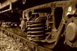 Close-up of rust-covered train suspension coil springs within an aged bogie frame, showing detailed texture, corrosion, and industrial wear on the railway track