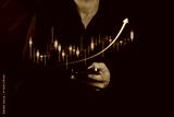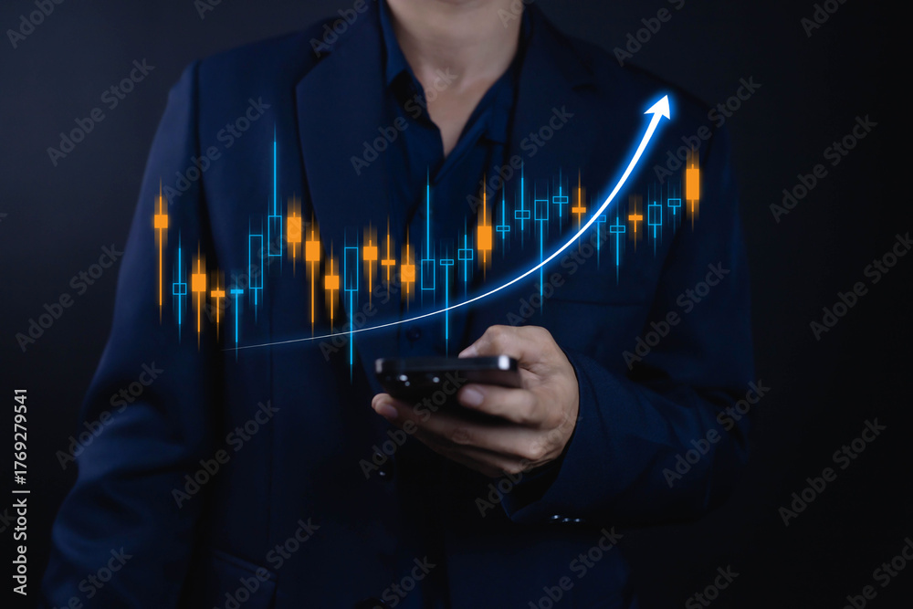 Businessman analyzing stock market data on smartphone with digital candlestick chart and upward arrow, symbolizing financial growth, investment strategy, and technology in online trading success.
