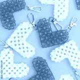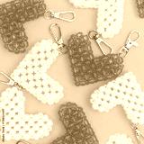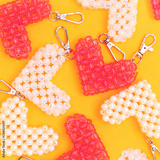 Various handmade keychains in a heart shape made from acrylic beads scattered on a yellow background.