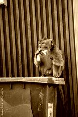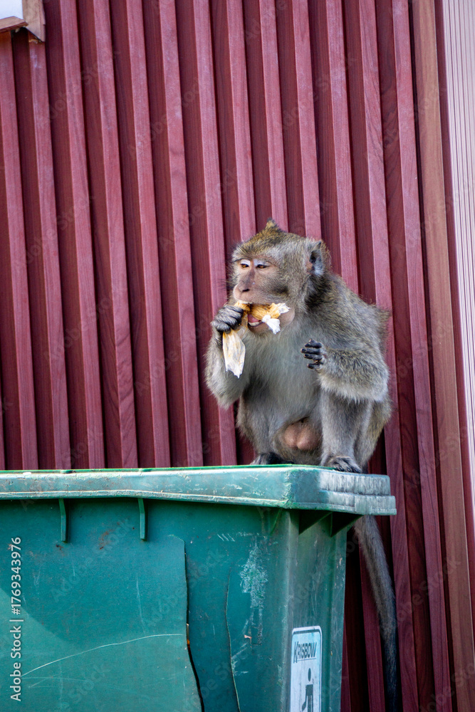 Starving monkey is eating plastic. Eating used plastic food wrappers.