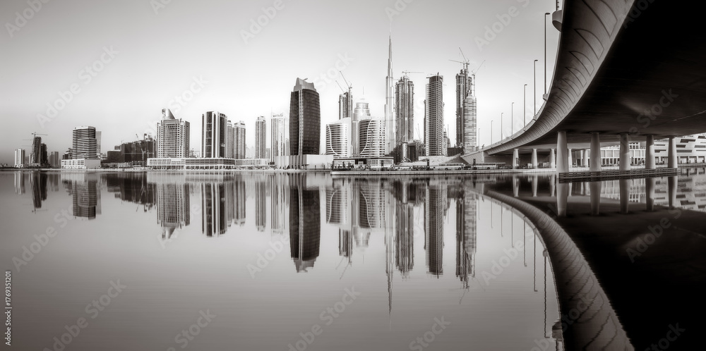 Skyscrapers and bridge over water, black and white style, city background, Dubai Marina bay UAE
