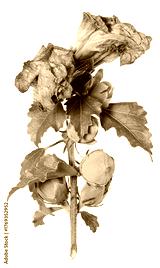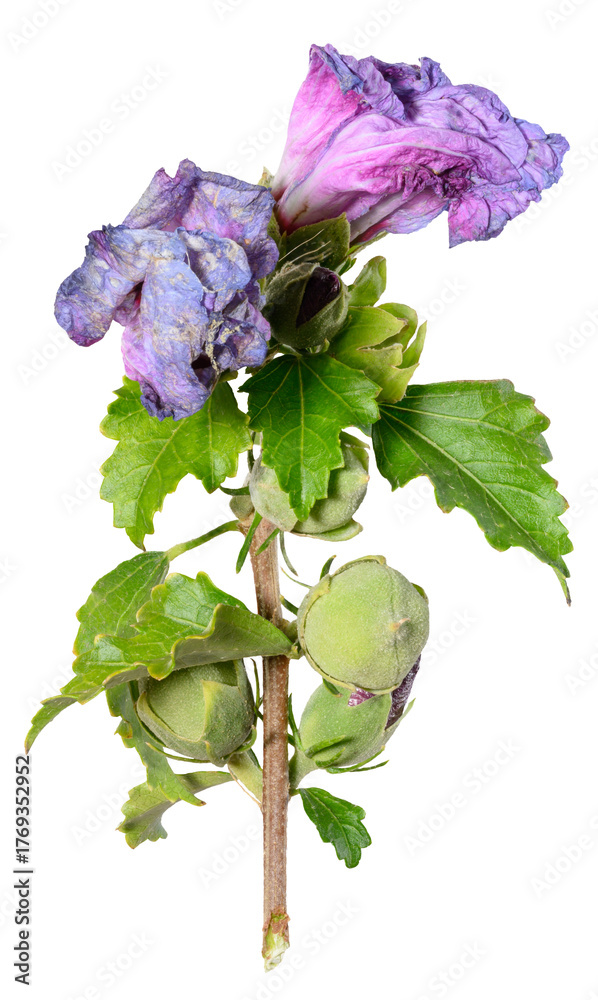 Fading pink hibiscus flower with green leaves on isolated background