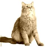 A fluffy ginger cat sits at full height, looking up with curiosity. Isolated background