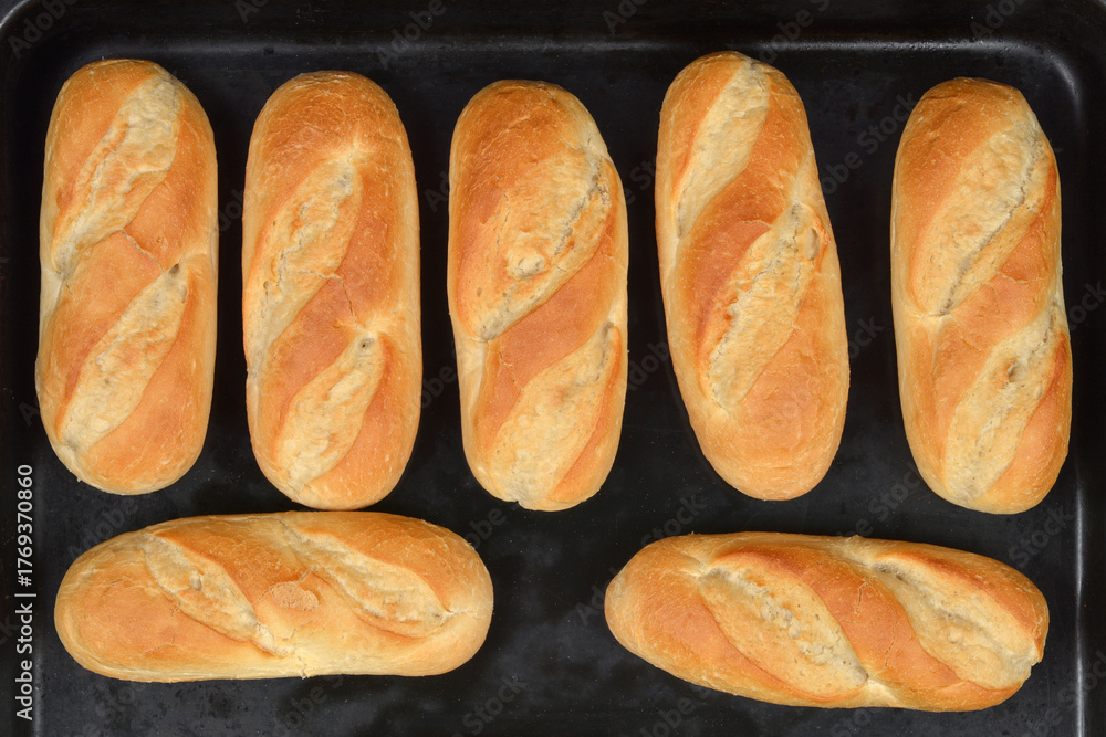 An overhead shot of multiple freshly baked, golden-brown bread rolls arranged on a dark baking sheet