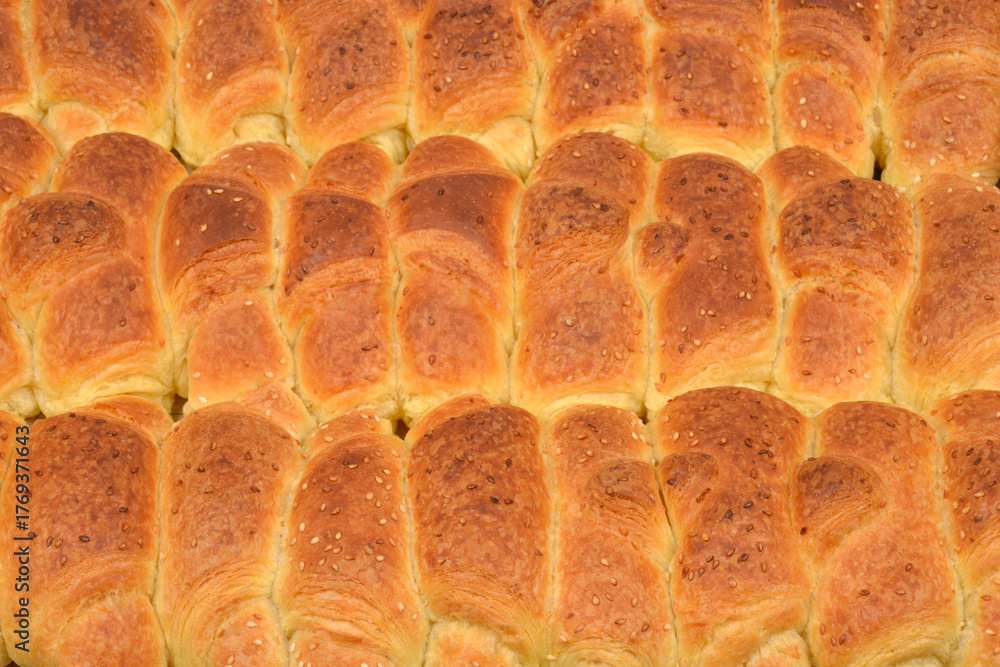 A full-frame close-up shot captures rows of freshly baked, golden-brown crescent-shaped yeast rolls sprinkled with sesame seeds