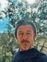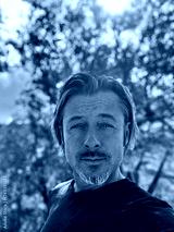 Man with blond hair and grey stubble beard in blue t-shirt outside in sunny spanish garden on the countryside.