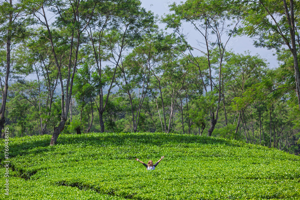 Young woman stands with outstretched arms in the middle of lush green tea plantations, surrounded by tall trees. This vibrant image captures freedom, eco-tourism, and travel in asian tropical nature.