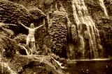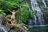 Woman rising hands up, stand in natural pool below Banyumala Twin Waterfalls. Water flowing under cascading high waterfall. Adventure lifestyle at family holidays travel in Bali tropical rainforest.