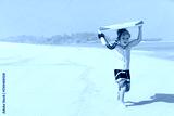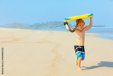 Portrait of little surfer boy with bodyboard have fun on beach, walk by white sand beach. Summer adventures, active families, parents and kids lifestyle, sports activities on school holiday with kids