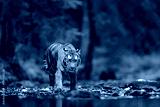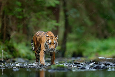 Amur tiger walking in river water. Danger animal, tajga, Russia. Animal in green forest stream. Grey stone, river droplet. Siberian tiger splash water. Tiger wildlife scene, wild cat, nature habitat.