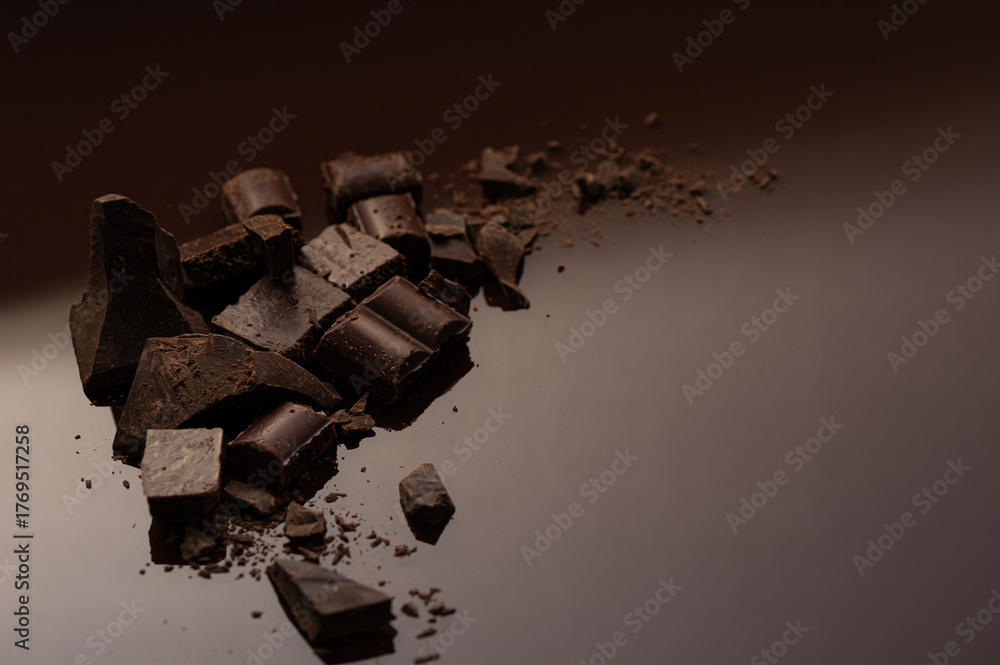 Delicious dark chocolate pieces scattered on a smooth surface ready for baking or snacking delight