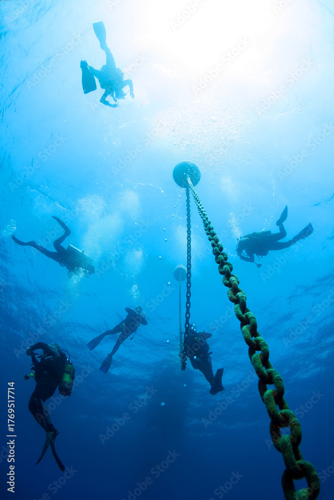 Group of silhouettes of divers at a safety stop at the anchor chain under a boat in the sea.