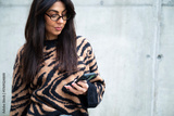 Beautiful young woman with eyeglasses using her phone outdoor