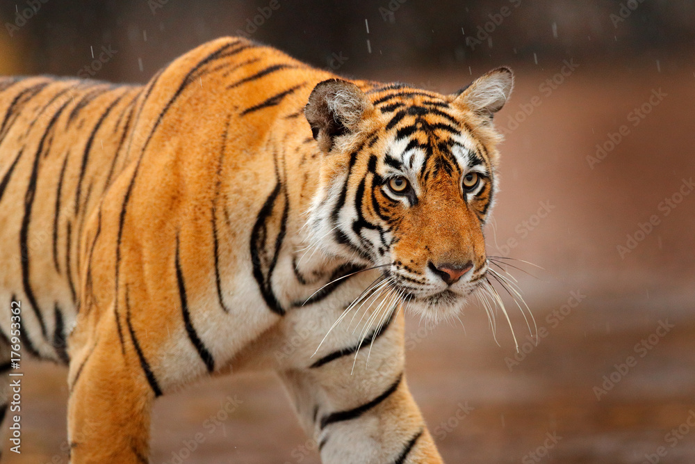 Big wild cat, endangered animal. End of dry season, beginning monsoon. Tiger walking in green vegetation. Wild Asia, wildlife India. Indian tiger, wild animal in nature habitat, Ranthambore, India.