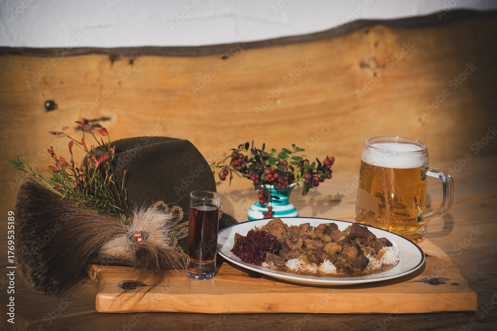 decorative wood table after the happy hunt - ready to eat goulash from venison with a glass of beer
