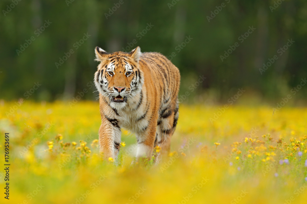 Tiger with yellow flowers. Siberian tiger in beautiful habitat. Amur tiger sitting in the grass. Flowered meadow with danger animal. Wildlife Russia. Summer with tiger. Animal walking in bloom.