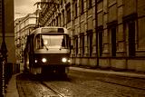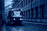 Historic red and cream Tatra T3 tram operating at night in Prague, Czech Republic.