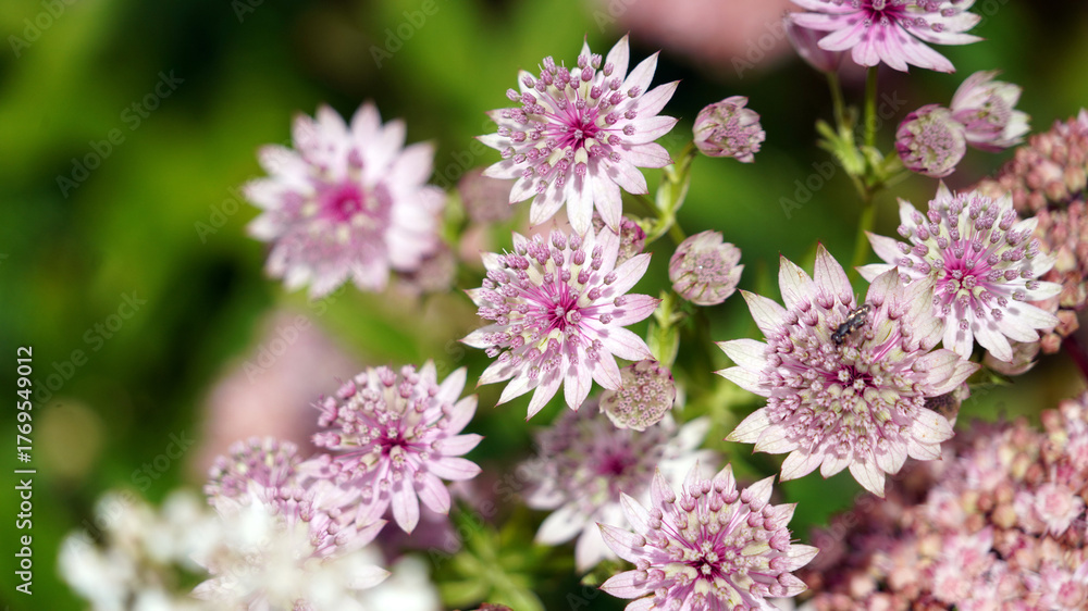 Macro image of pink Greater Masterwort flowers, Cumbria, England