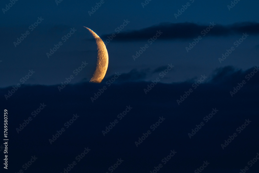 Crescent moon setting behind dark clouds at dusk. The bright lunar surface contrasts with the deep blue sky, creating a dramatic night atmosphere.
