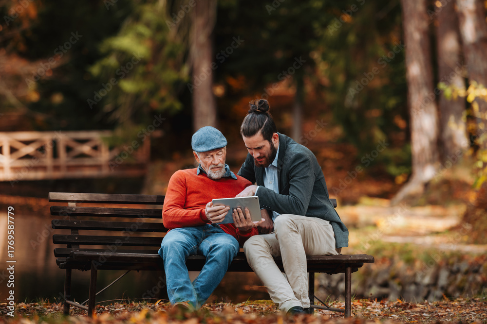 Senior father and his son sitting on bench by lake in nature, looking at tablet.