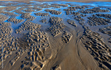 Tidal creeks at low tide on the sandy beach of Norderney island (Germany) flowing towards the North Sea and currents forming meandering temporary river beds. Blue sky mirroring in water surface.
