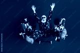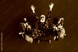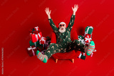 Cheerful Santa in festive pajama suit sits in red chair surrounded by gifts with striped socks celebrating christmas eve at home