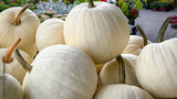 White pumpkins arranged in a market setting on a sunny day during the autumn season