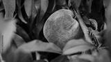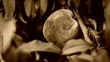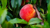 A ripe peach is hanging on a branch, surrounded by vibrant green leaves, on a warm late summer day in a luscious orchard