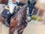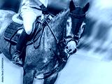 Dapple gray dressage horse and rider in uniform performing jump at show jumping competition. Equestrian sport background. Silver dapple horse portrait during dressage competition. Selective focus.
