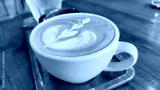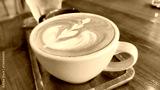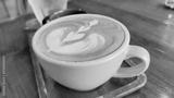 A close-up shot of a beautifully crafted latte art in a yellow cup. It rests on a wooden tray