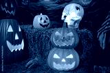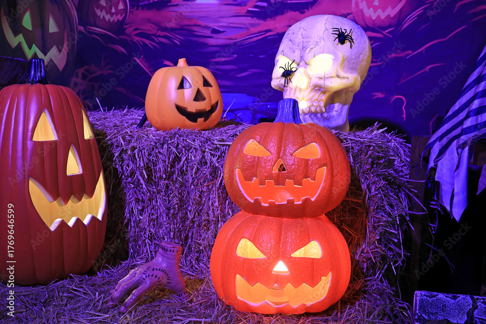 Closeup of Lit Halloween Jack O Lantern Pumpkins and Replica Skull in the Backyard
