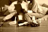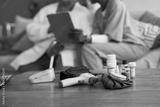 Senior Black woman consulting with young female nurse in medical scrubs using digital tablet, medical equipment and medication bottles arranged on wooden table in foreground
