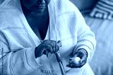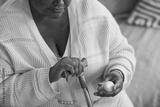 Elderly Black woman holding walking cane in one hand and opening prescription medication bottle with other hand, sitting indoors, focusing on daily health routine