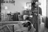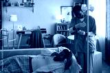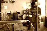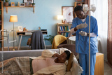 Senior Black woman lying on sofa under blanket, receiving intravenous therapy from young adult Black female nurse, wearing medical gloves, adjusting IV drip in home setting