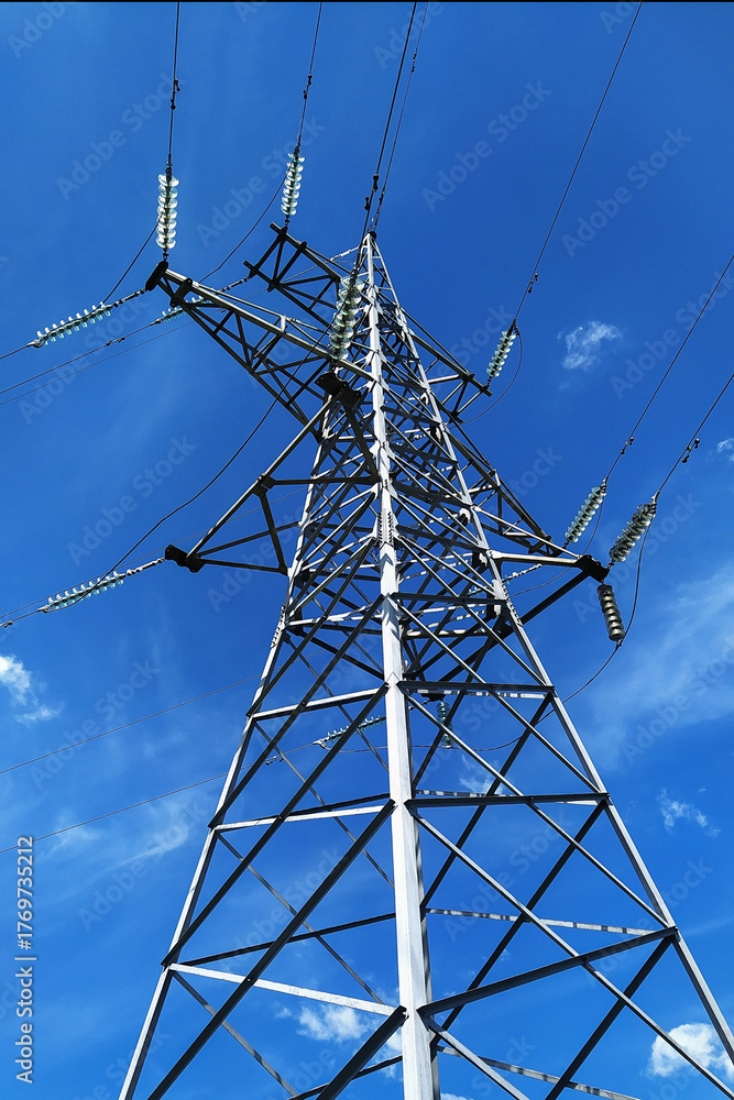 A metal pole supporting high-voltage power lines against a clear blue sky.