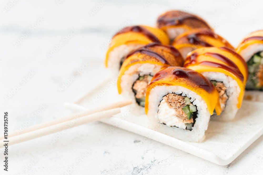 Sushi roll with salmon, avocado and tuna. Sushi set served on the white plate next to red ginger with wooden sticks on the white background