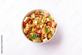 Warm salad with colorful full grain fusilli pasta, olives, fried tofu, cherry tomatoes and aromatic oregano leaves in ceramic bowl on white marble table top view. Healthy vegan food concept.