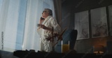 Man in White Hotel Bathrobe Stands By Window, Sipping Tea While Engaged in Phone Call, on Table Breakfast Tray and Glass of Juice. Staying Professionally Connected From Comfort of Hotel. Handheld.