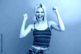 Young woman celebrates success wearing a red patterned top against a blue background smiling and raising arms