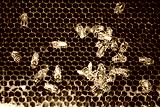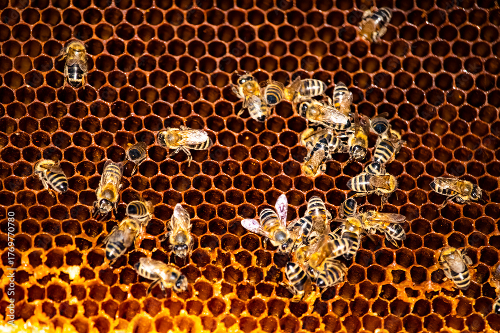 Close-up view of honeybees working on a honeycomb filled with golden wax cells. The bees crawl across the hexagonal pattern, collecting nectar and maintaining the hive’s structure.