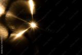 Lens Flare. Light over black background. Easy to add overlay or screen filter over photos. Abstract sun burst with digital lens flare background. Gleams rounded and hexagonal shapes, rainbow halo.