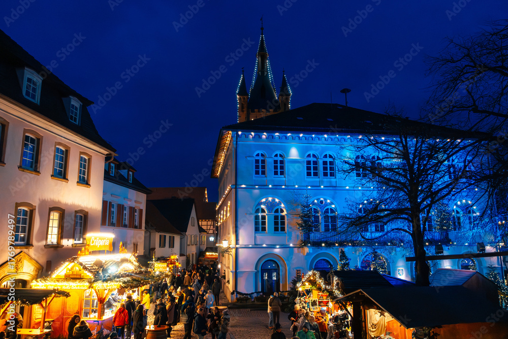 Christmas Market Night in Historic Town With Festive Lights, Stalls, and Crowded Shoppers
