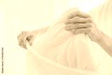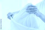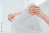Woman putting a pillow into a pillowcase. Bedding washing and care as part of home cleaning routine.