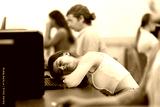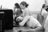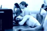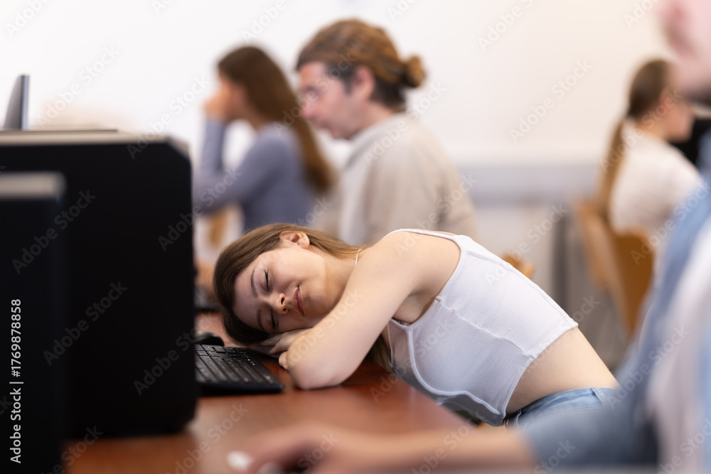 Tired girl pupil from group of students computer education programming web design sleeps sitting in classroom. .