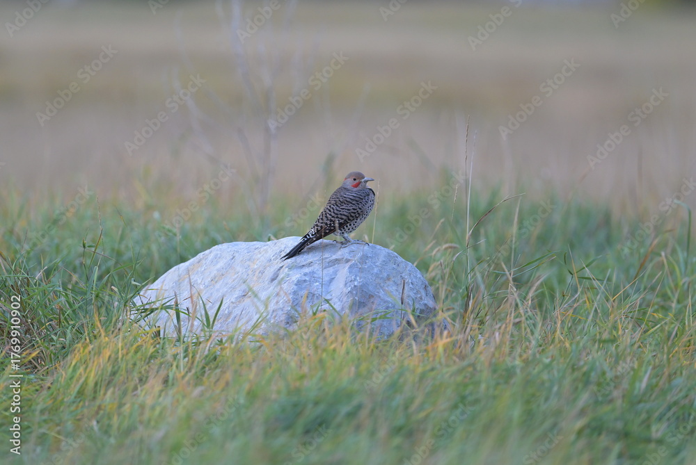 red sign, northern flicker, woodpecker on a stone, field, nature, autumn, outdoors, wildlife, Canada, Alnerta,