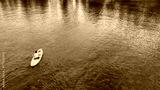 Aerial view woman bright yellow kayak with in the vast expanse of crystal clear turquoise water. The seabeds rocky texture is visible beneath the surface, concept marine environment